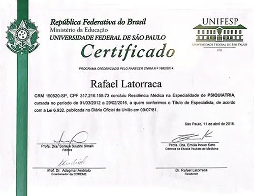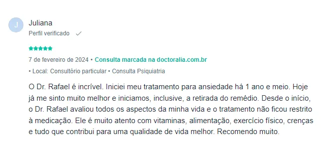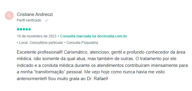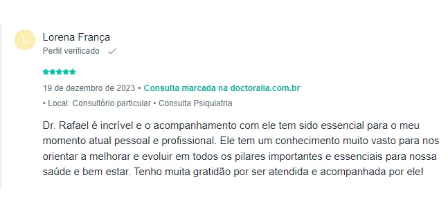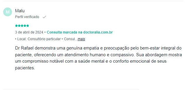 Com uma paixão genuína pela psiquiatria e pelo bem-estar de seus pacientes, o Dr. Rafael Latorraca se dedica integralmente à saúde mental e espiritual de cada pessoa que cruza seu caminho. Quando você se torna paciente do Dr. Rafael, você não é apenas mais um; você se torna parte de uma família cuidadosamente assistida por ele.